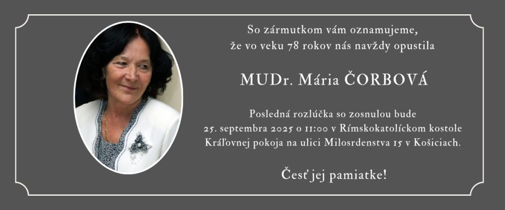 Dňa 17. septembra 2025 sme s hlbokým zármutkom prijali smutnú správu o úmrtí MUDr. Márie Čorbovej.