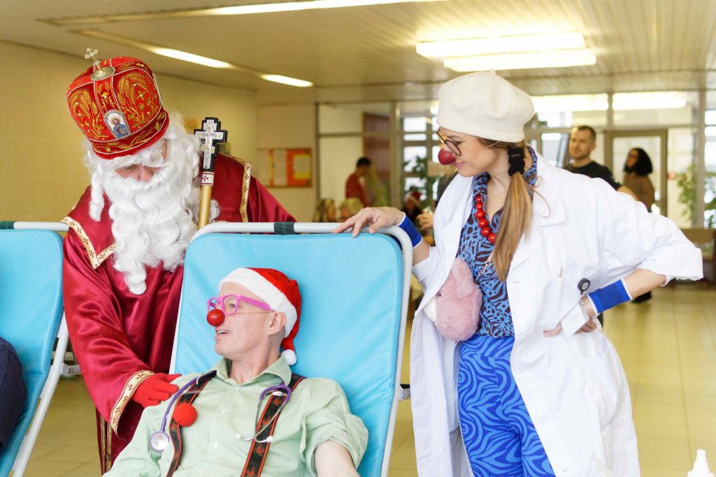 Dobrú náladu, spev aj humor, a to priamo v odberových kreslách, zažili darcovia krvi vďaka dvojici klaunov z OZ Červené nosy Clowndoctors – Sestre Svižnej a Doktorovi Harmančekovi, ktorý si na záver s odvahou a presvedčením sadol do odberového kresla a so spevom daroval krv.